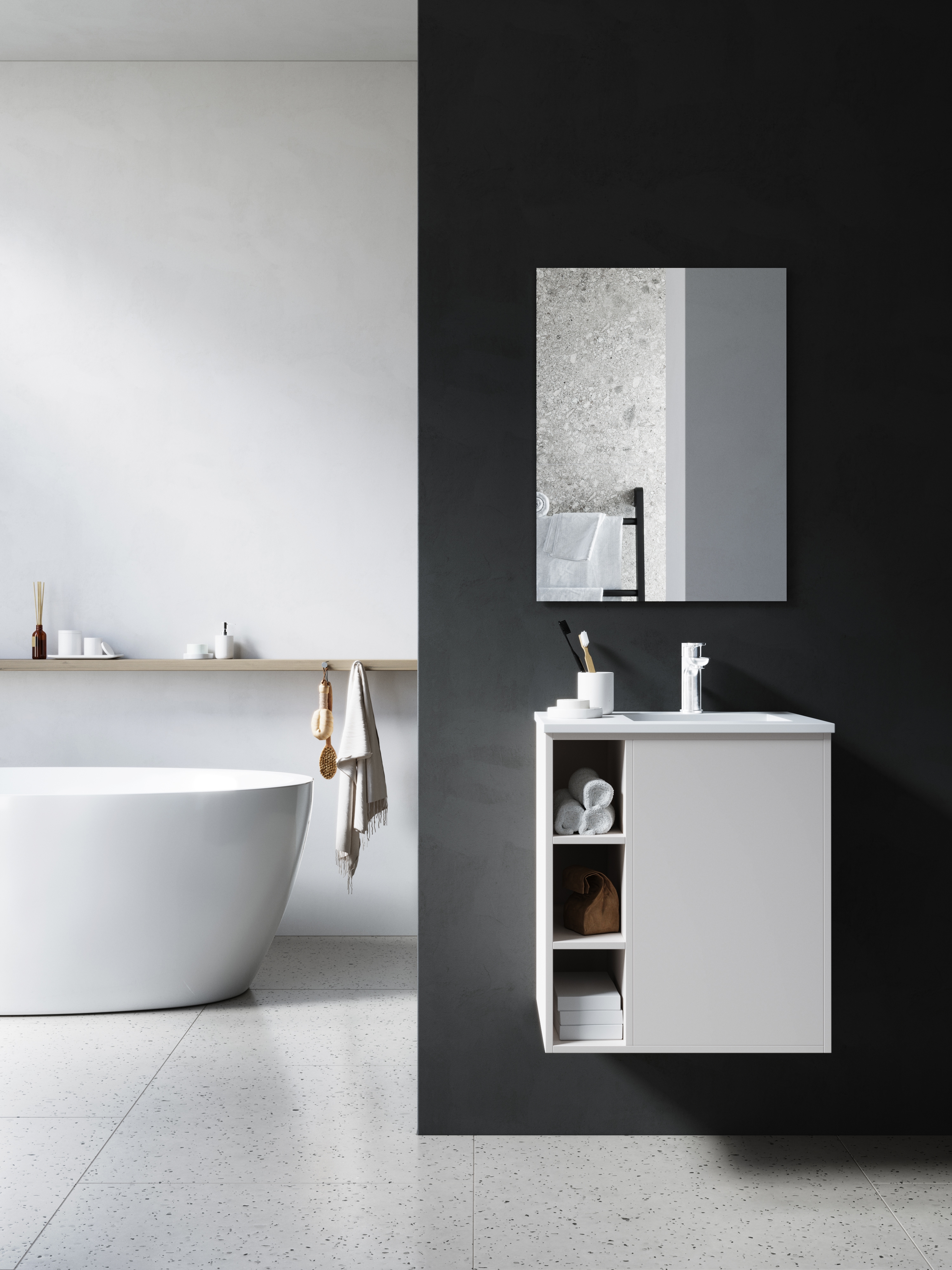 Onze Milk-badkamerkast is vlot toegankelijk en praktisch, maar met toch een jeugdige, informele knipoog naar badkamerdesign. Je vindt alles elke ochtend netjes georganiseerd en binnen handbereik terug in zowel open legplanken als achter gesloten deuren. Perfect voor de kleinere badkamer!